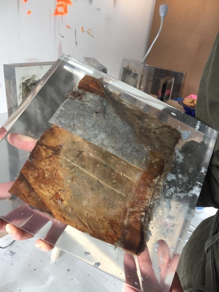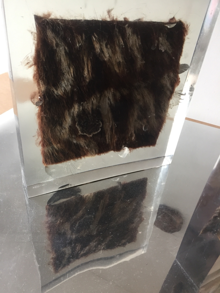Rebekka Benzenberg löst das Futter aus den Kleidungsstücken und liest auf den Rückseiten der vernähten Pelze Prozesse ihrer einstigen Entstehung ab, kleine Notizen auf dem Leder und Nähte lassen die komplexen Arbeitsschritte der Pelzverarbeitung nachvollziehen. Vorder- und Rückseiten macht die Künstlerin sichtbar, indem sie einzelne Pelzstücke in Polyesterquadrate einschließt, sie dort förmlich „einfriert“. Die Vorderseiten werden teilweise gebleicht oder angesprüht. Je nach Lichteinfall erhält das Polyester einen natürlichen Charakter, wie eine Eisschicht, in der Luftbläschen eingeschlossen sind, strahlende Effekte sind das Resultat.