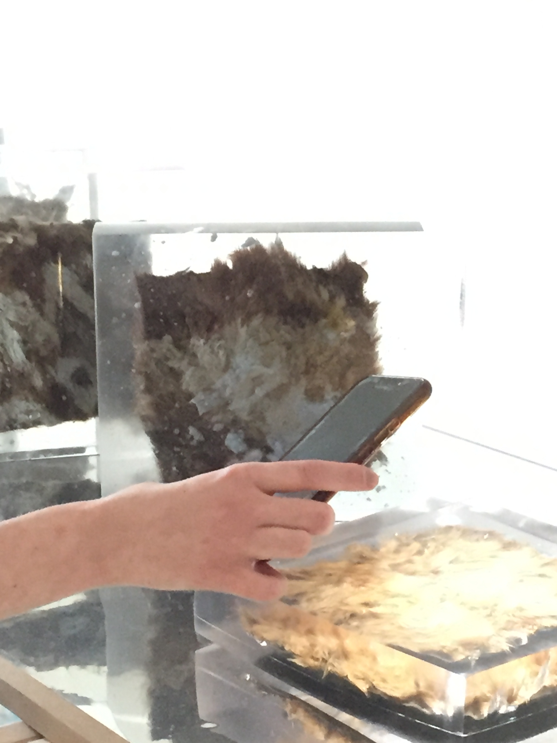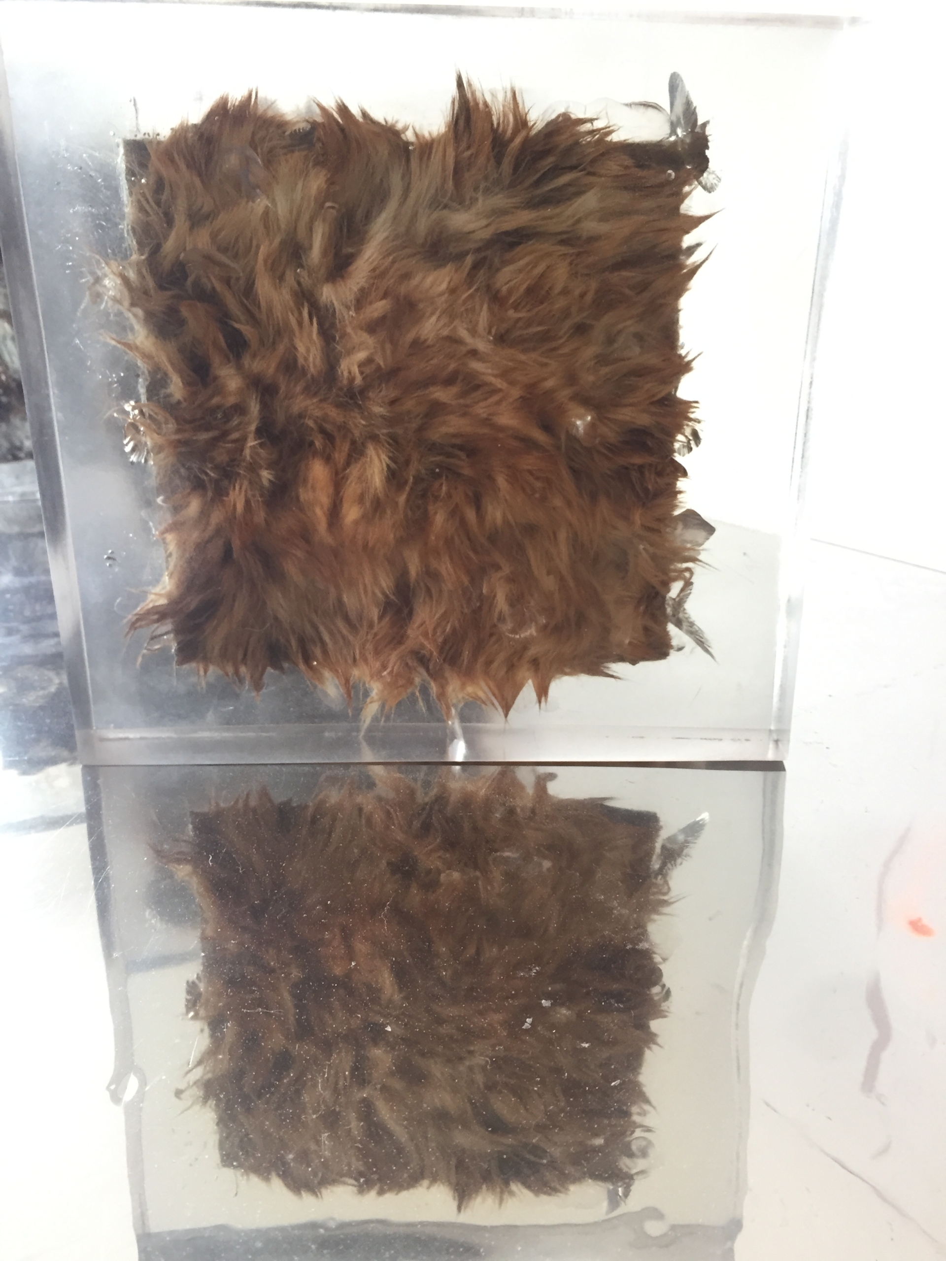Rebekka Benzenberg löst das Futter aus den Kleidungsstücken und liest auf den Rückseiten der vernähten Pelze Prozesse ihrer einstigen Entstehung ab, kleine Notizen auf dem Leder und Nähte lassen die komplexen Arbeitsschritte der Pelzverarbeitung nachvollziehen. Vorder- und Rückseiten macht die Künstlerin sichtbar, indem sie einzelne Pelzstücke in Polyesterquadrate einschließt, sie dort förmlich „einfriert“. Die Vorderseiten werden teilweise gebleicht oder angesprüht. Je nach Lichteinfall erhält das Polyester einen natürlichen Charakter, wie eine Eisschicht, in der Luftbläschen eingeschlossen sind, strahlende Effekte sind das Resultat.