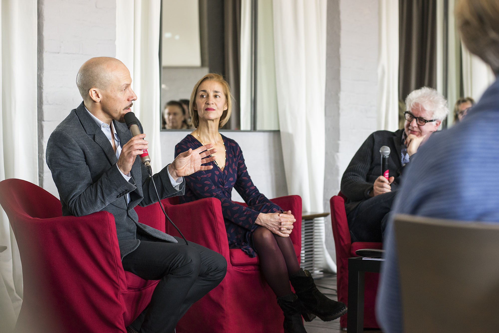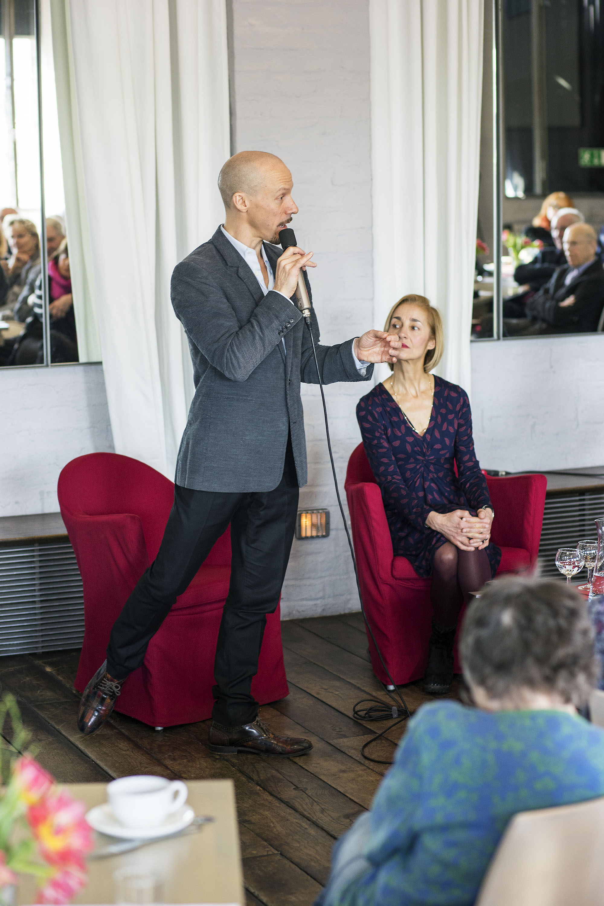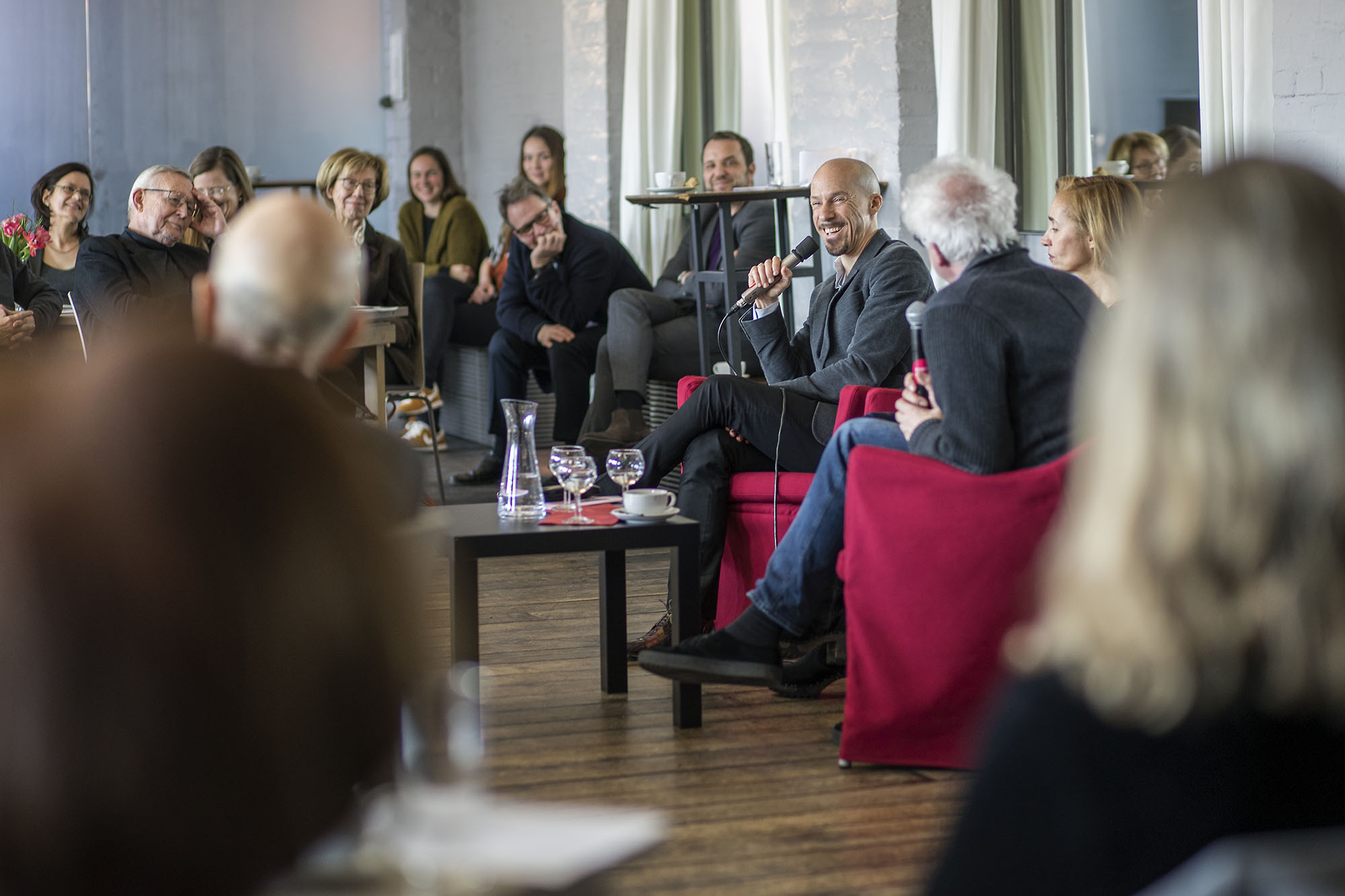 Richard Siegal begeisterte unsere jour fixe-Gäste mit seinem charmanten und inspirierenden Auftreten. Ein Stunde lauschten ihm die Zuhörer gebannt, wie er – gebürtiger Amerikaner – von der Tanzszene in Europa angezogen wurde und nach seiner aktiven Zeit mit William Forsythe dann seine eigene Kompanie aufbaute. Um seine Choreografie-Methoden sichtbar und für alle Anwesenden leicht verständlich zu machen, hielt es Richard kaum auf seinem Platz – ein unvergesslicher Tanz-Vormittag!