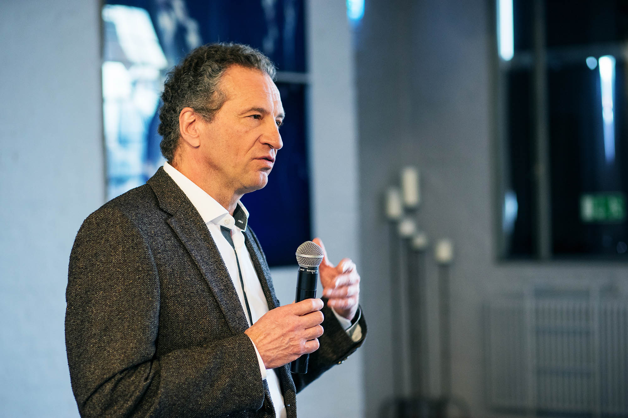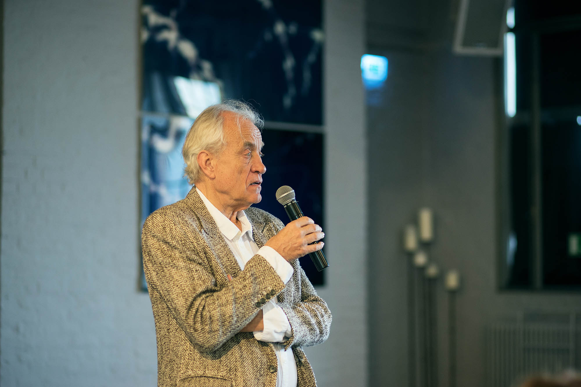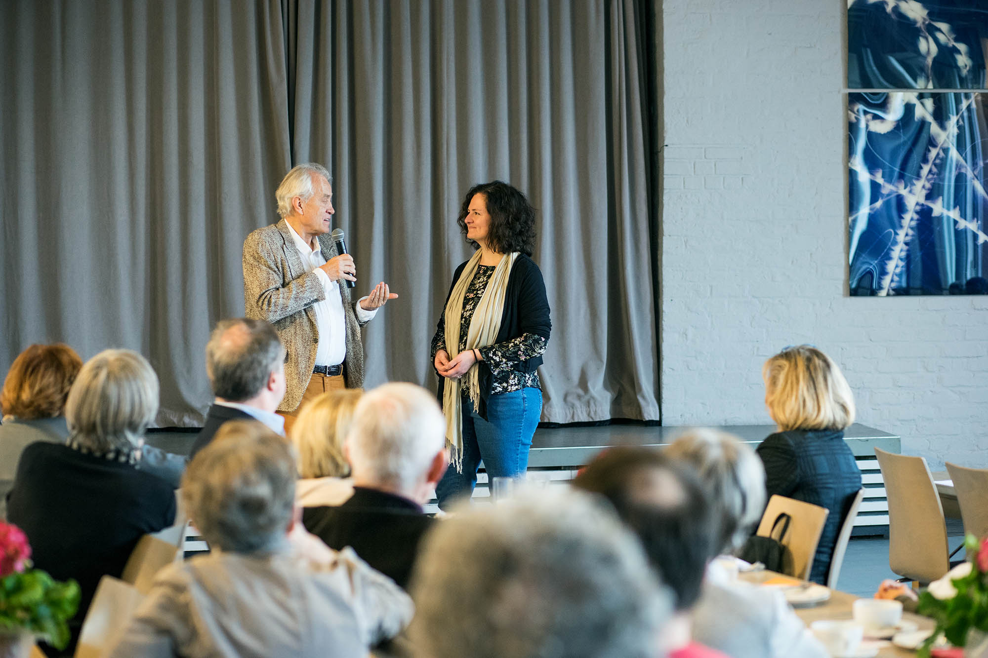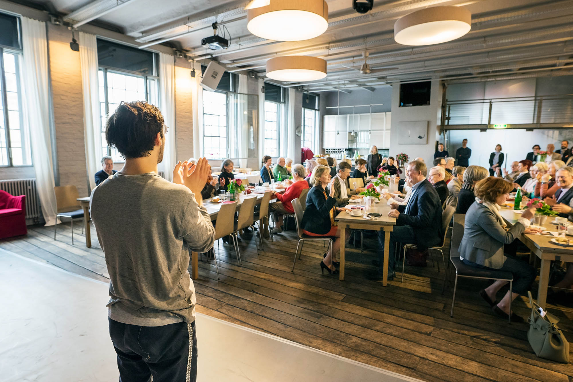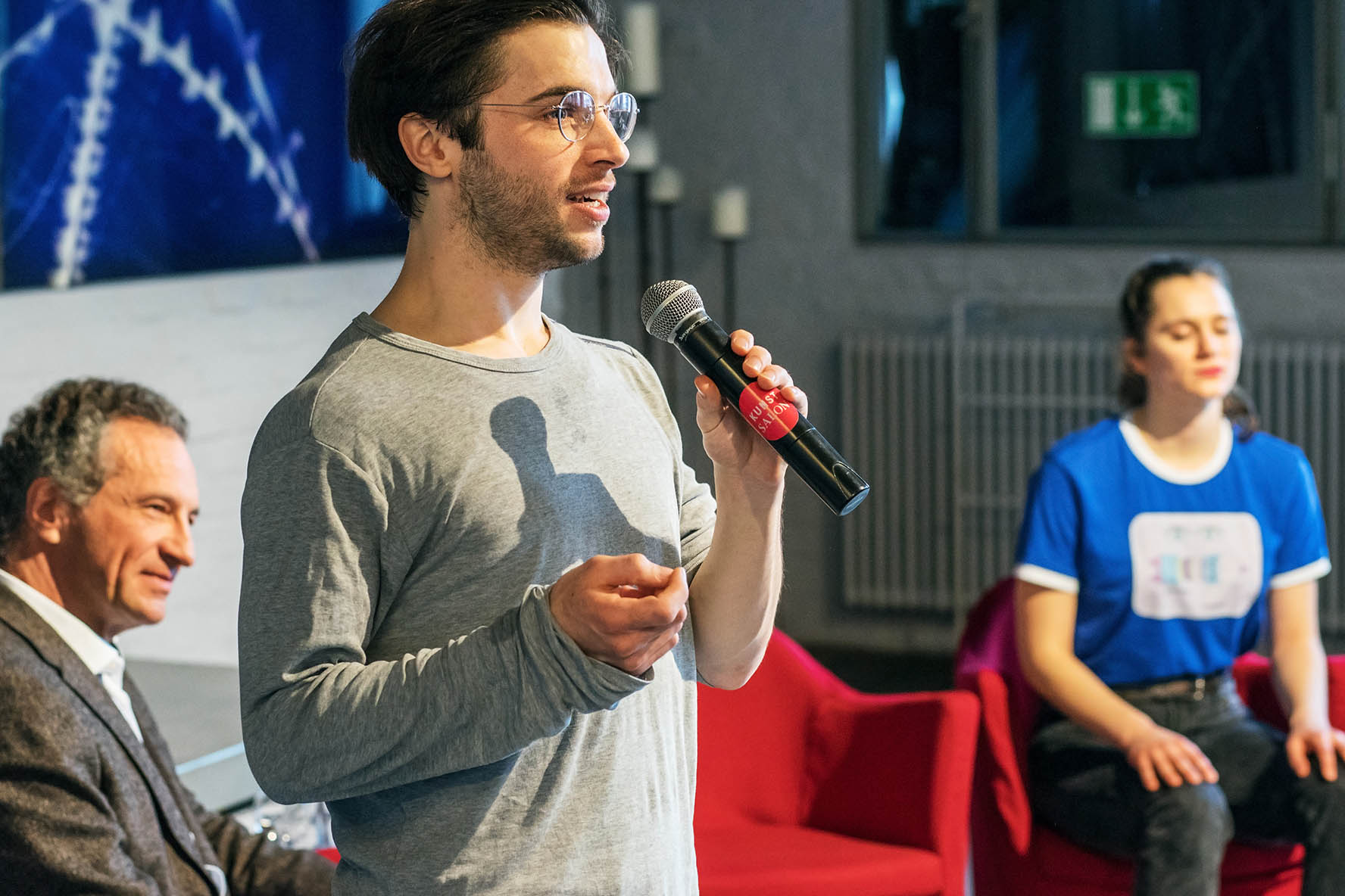 Es spielten Sophie Killer und Constantin Hochkeppel. Im anschließenden Gespräch zwischen den beiden Künstlern und Andreas C. Müller, dem Vorstandsvorsitzenden des KunstSalon e.V., gaben Hochkeppel und Killer spannende Einblicke in das ganz spezielle und noch relativ unbekannte Genre des Physical Theatre, das sich innerhalb der Grenzen von Theater und Tanz bewegt. Geschichten mithilfe des Körpers zu erzählen, über Bewegungen, Mimik und Gesten, steht dabei, ganz vereinfacht ausgedrückt, im Mittelpunkt. Dies wurde auch für einen Moment mit einer einfachen Übung für die Besucher des jour fixe erfahrbar: Indem sie eingeladen wurden, repetitive Übungen unter Einsatz von Körper und Stimme individuell, aber synchron mit den anderen Besuchern, auszuführen. Ein im wahrsten Sinne des Wortes bewegender Vormittag im KunstSalon!