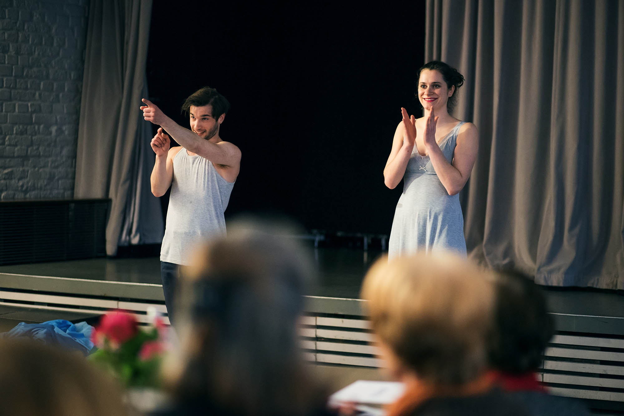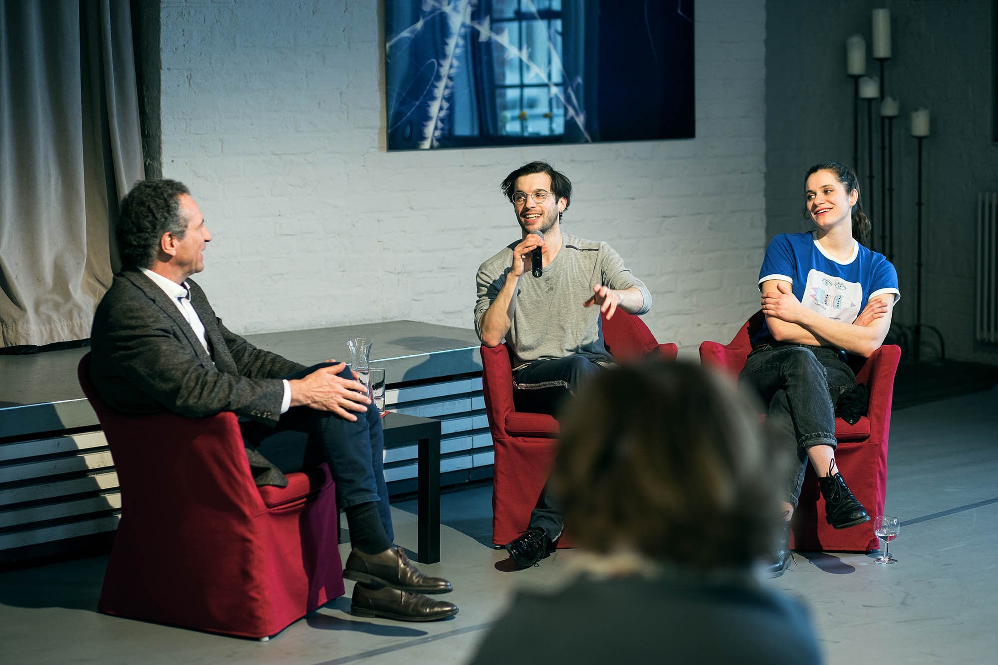 In der anschließenden Begegnung mit den Künstlern der KimchiBrot Connection zeigten wir einen Ausschnitt ihrer Performance „living happily ever after“, die auch 2017 von uns mit dem KunstSalon-Theaterpreis ausgezeichnet wurde! Ausgehend von ihren eigenen Liebesidealen, setzen sie sich darin mit der von Hollywood propagierten Vorstellungen von Liebesbeziehungen auseinander und lassen sie auf alternative Beziehungsformen prallen. Dabei wird die Chronologie des Bühnengeschehens durch eingespielte Interviews komplettiert und gibt dadurch den perfekten Liebesszenen den realen Touch der „Imperfektion des Menschlichen“.