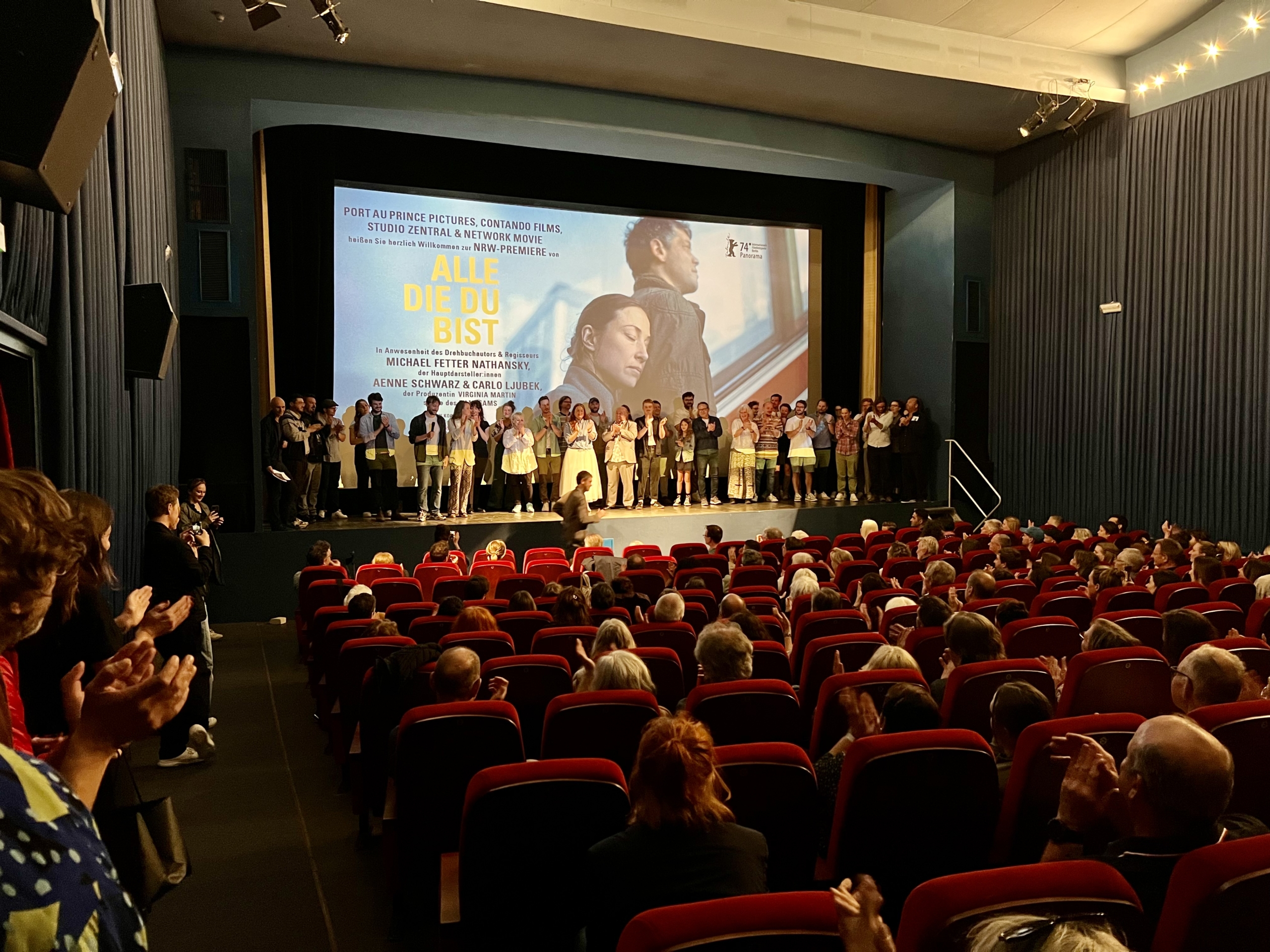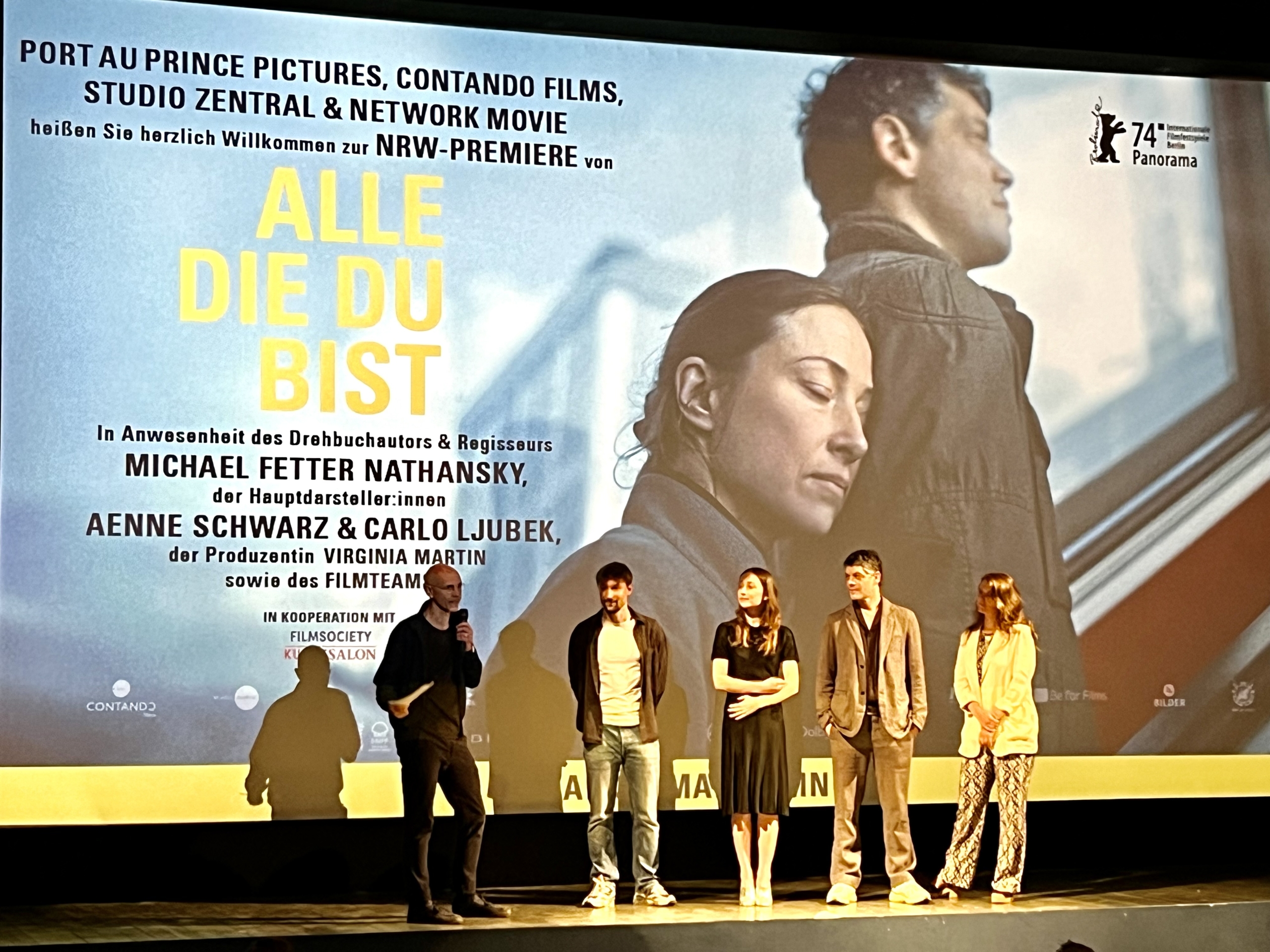 Es war eine Art Homecoming: Zum einen ist Regisseur Michael Fetter Nathansky in Köln aufgewachsen, zum anderen ist sein zweiter Kinofilm „Alle die Du bist“ in Köln und Umgebung gedreht. Und so schien sich die Bühne des komplett ausverkauften Odeon Kinos auch leicht durchzubiegen, als ein Großteil des Filmteams vor und hinter der Kamera nach dem beeindruckenden Film um eine endende Liebesbeziehung vor dem Hintergrund der Arbeiterklasse auf die Bühne geholt wurde. Im anschließenden Gespräch mit Filmsociety-Programmleiter Christian Meyer-Pröpstl erzählten der Regisseur, die Produzentin Virginia Martin und die beiden Hauptdarsteller*innen Carlo Ljubek und Aenne Schwarz von den Herausforderungen, aber auch den großen Glücksmomenten der Produktion des Films, der neben den vielen Zeitsprüngen auch eine weitere spannende Herausforderung für das Publikum bot, die aber an dieser Stelle nicht verraten werden soll. Denn den Überraschungseffekt sollte man nicht missen müssen, wenn man den Film, der am 30. Mai in die Kinos kommt, bundesweit zu sehen bekommt.